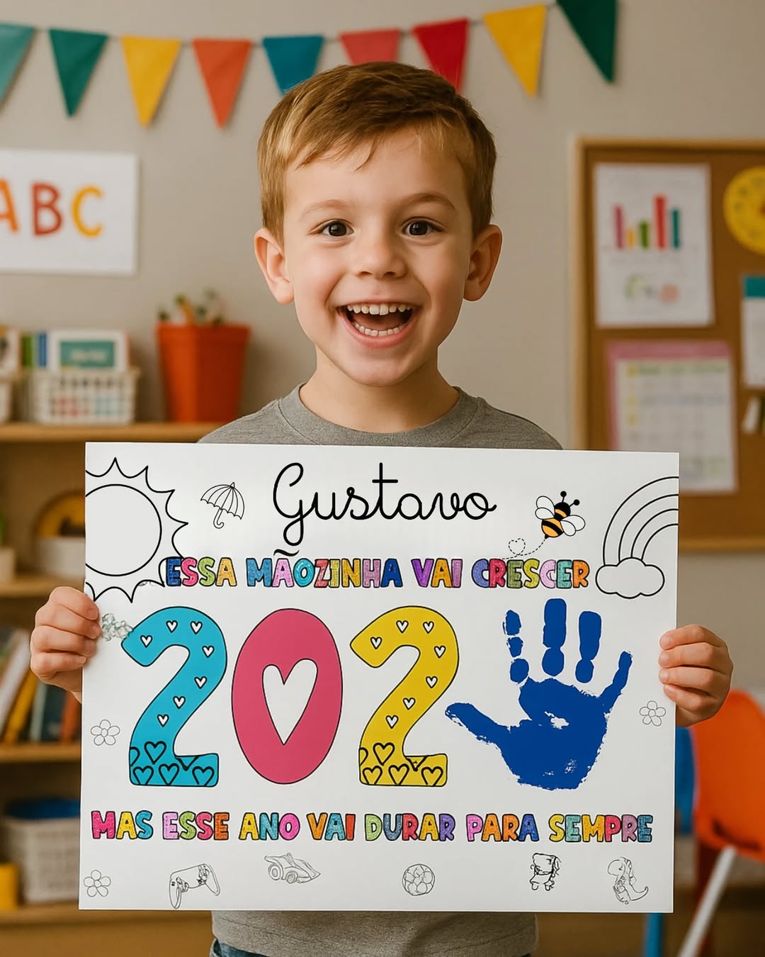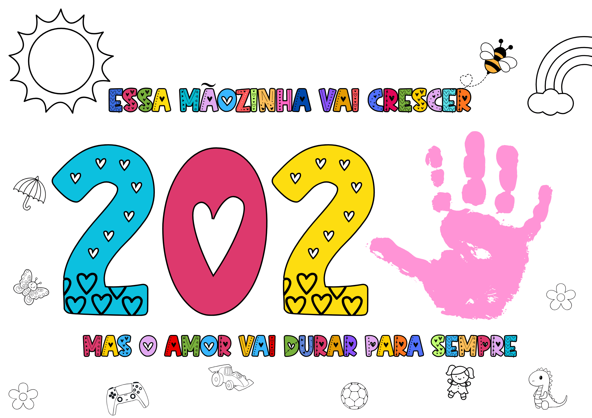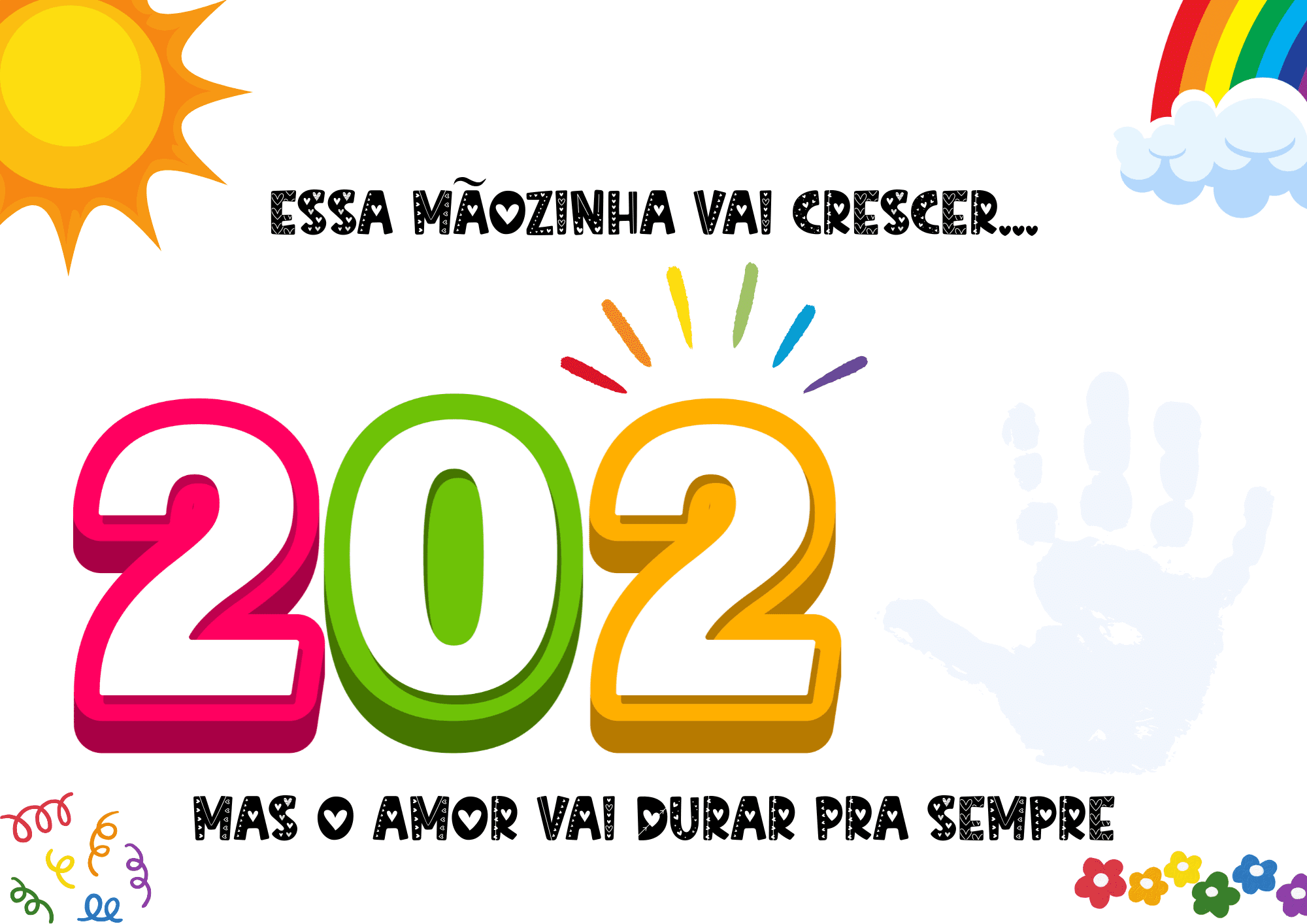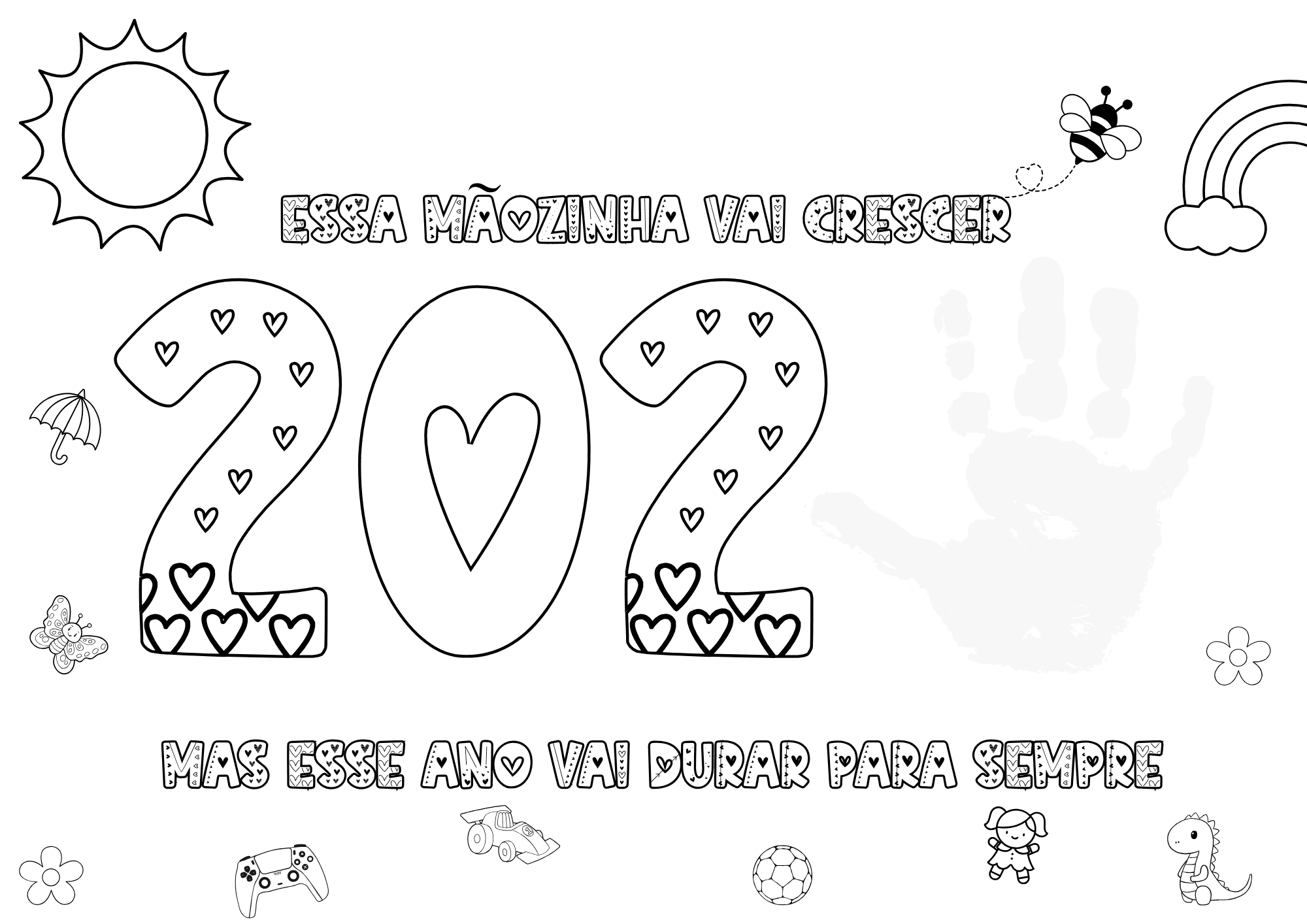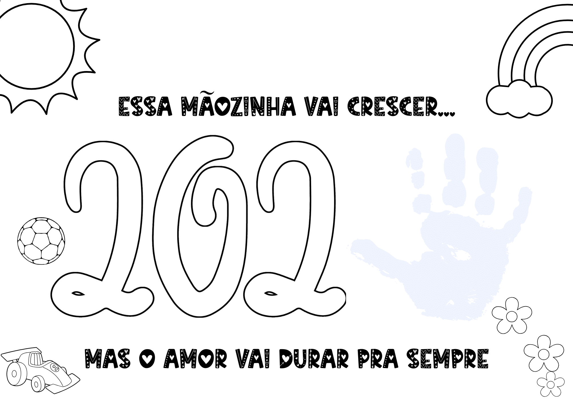 O arquivo “Mãozinhas que Marcam” é um material em PDF pronto para imprimir, onde as crianças registram o contorno ou o carimbo de suas mãos, criando uma lembrança única e cheia de significado.
