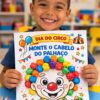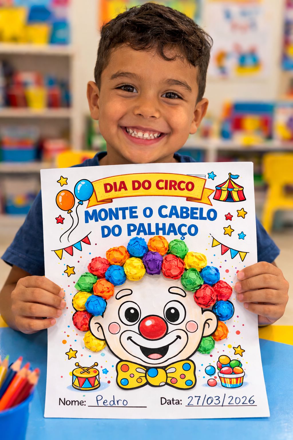 Atividade lúdica para o Dia do Circo em que a criança completa o cabelo do palhaço utilizando diferentes materiais, estimulando criatividade e coordenação motora.