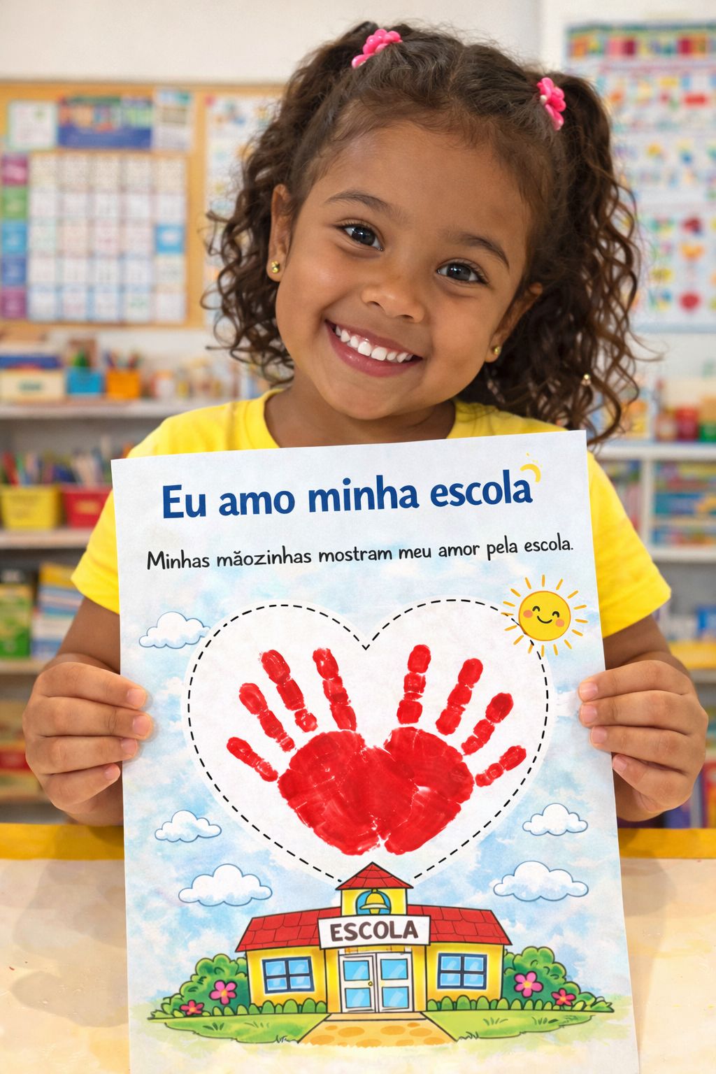 A criança carimba suas mãos dentro de um coração formando um registro visual do carinho pela escola. A atividade trabalha expressão afetiva, coordenação motora e identidade escolar.