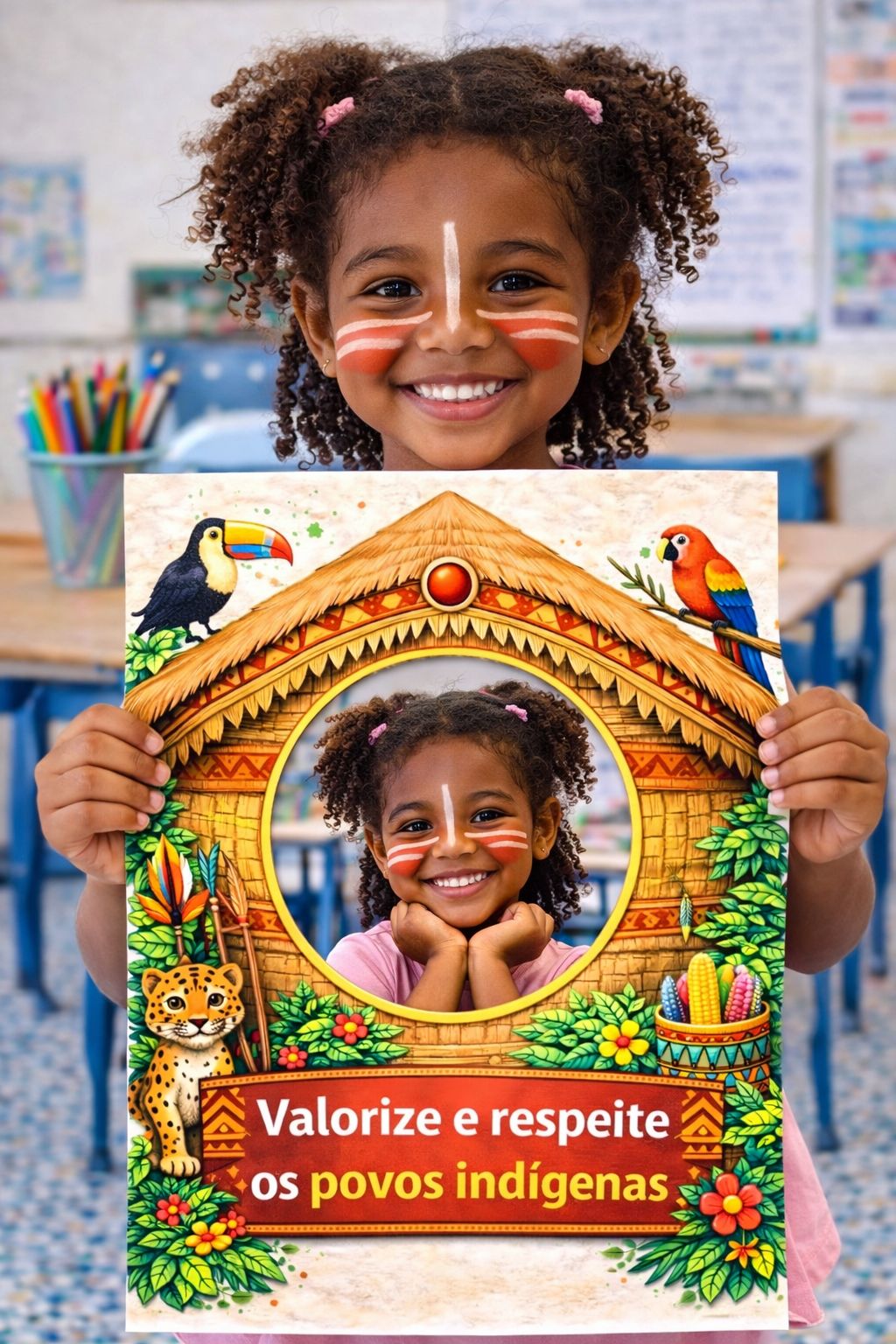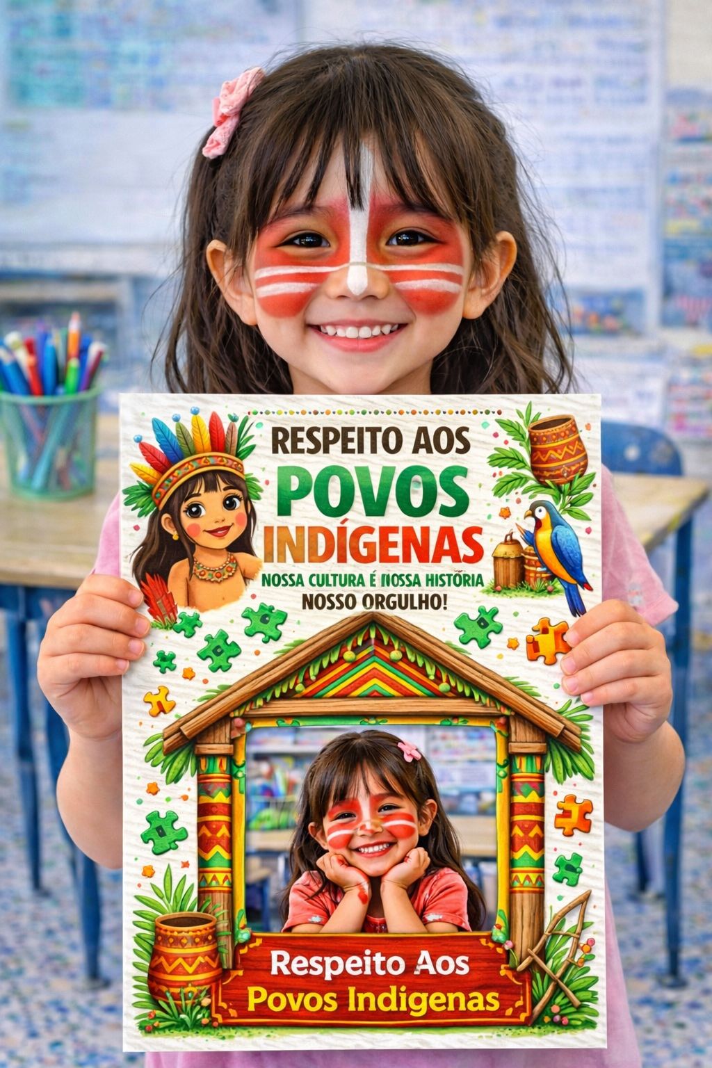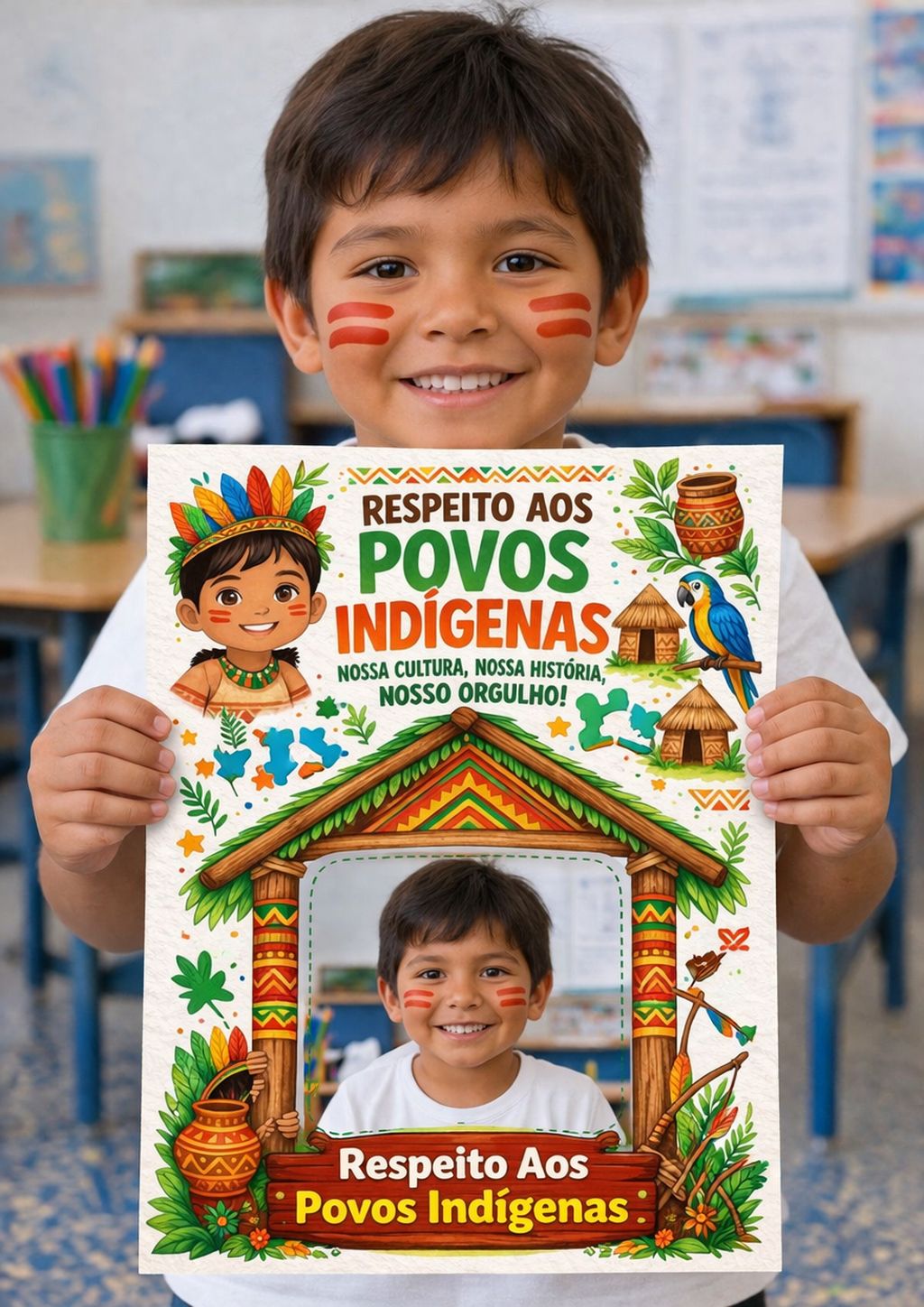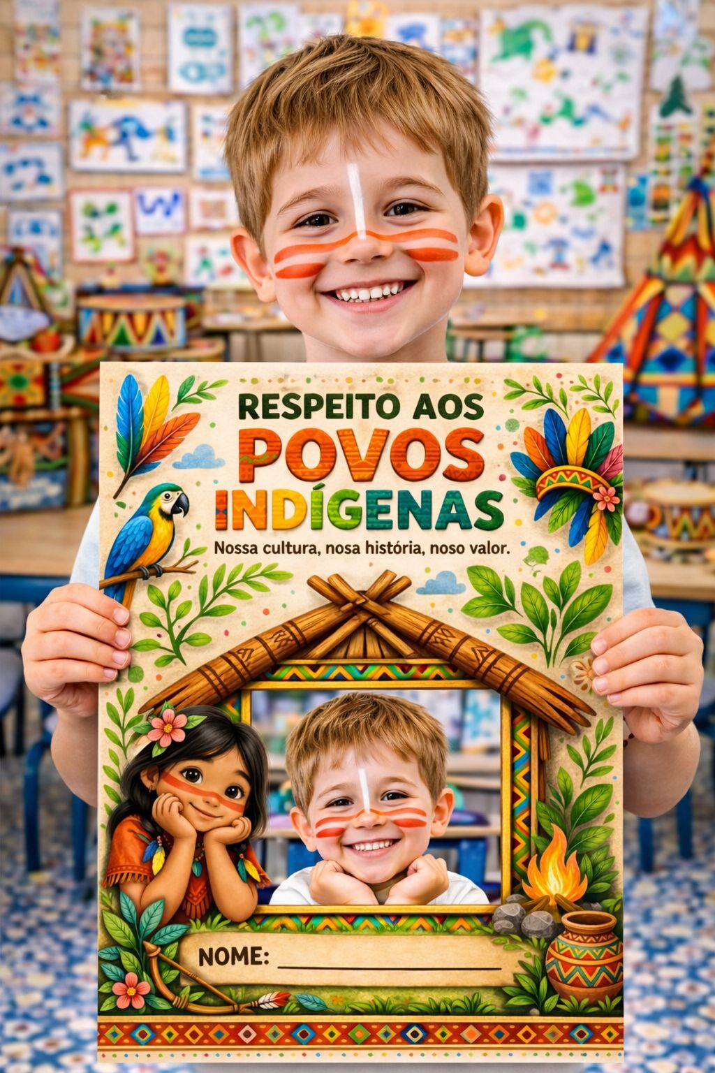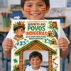 Material pedagógico com atividades para o Dia dos Povos Indígenas voltado à Educação Infantil, contendo painéis decorativos e atividades com foto do aluno para uso em sala de aula.