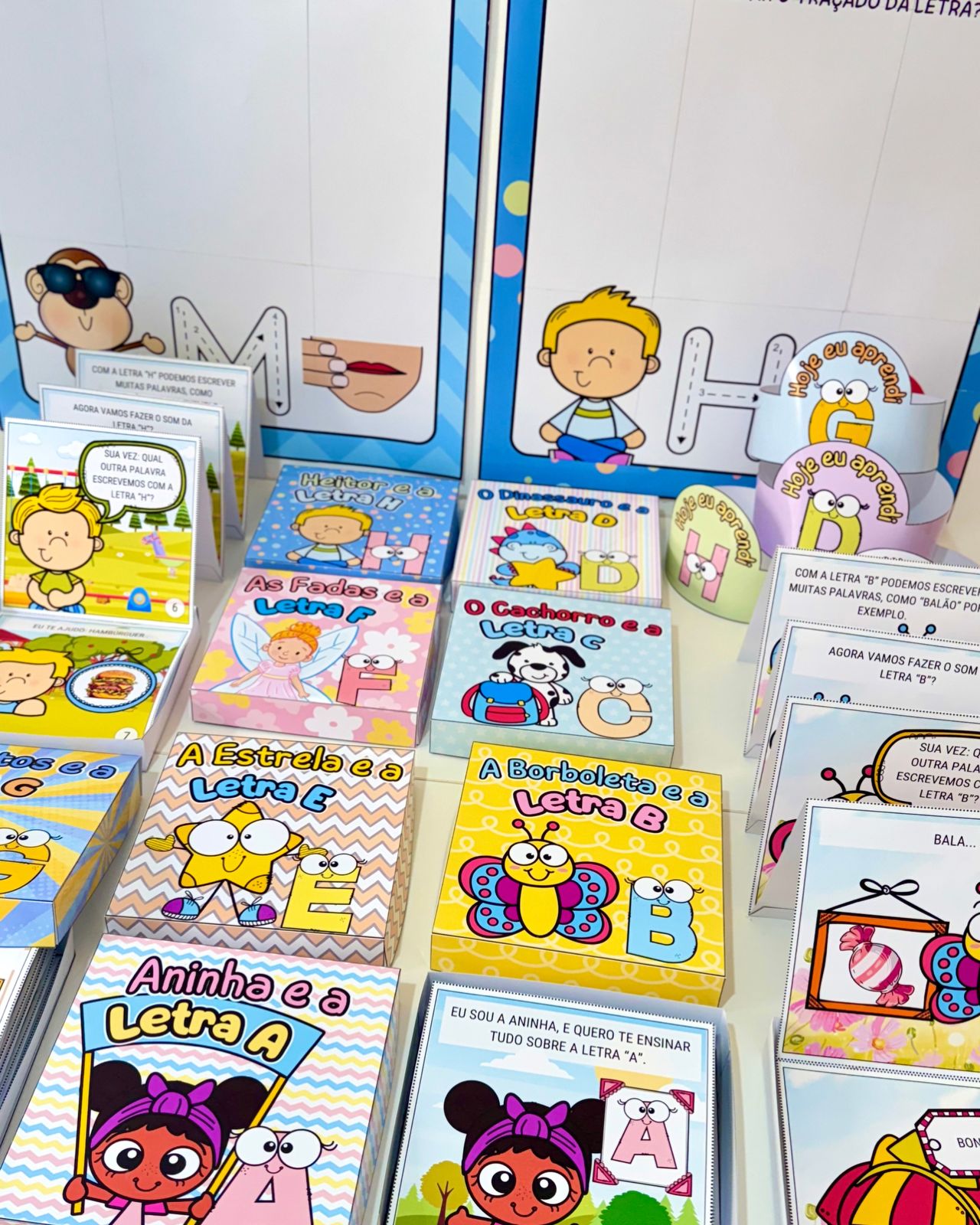 O combo reúne 26 kits completos, um para cada letra do alfabeto, com recursos visuais e atividades interativas que estimulam a participação das crianças durante o processo de alfabetização.