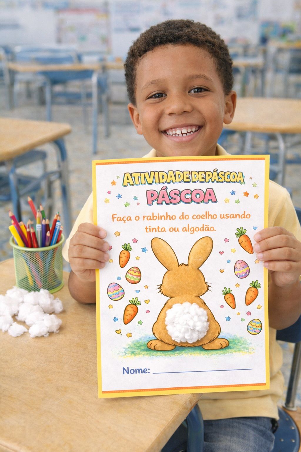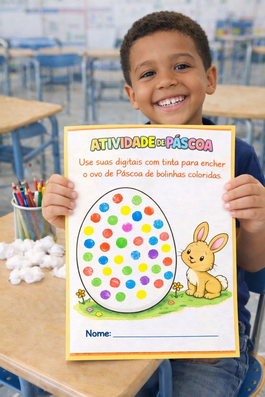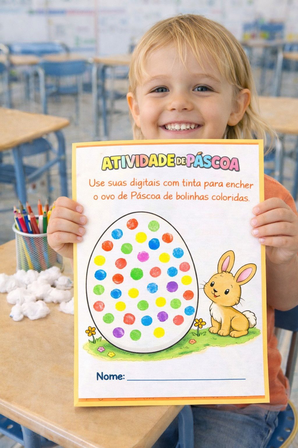 O kit reúne atividades lúdicas que permitem explorar diferentes formas de aprendizagem, como pintura, colagem, uso de tinta, coordenação motora e atividades sensoriais, tornando o trabalho com o tema da Páscoa mais divertido e significativo em sala de aula.