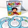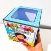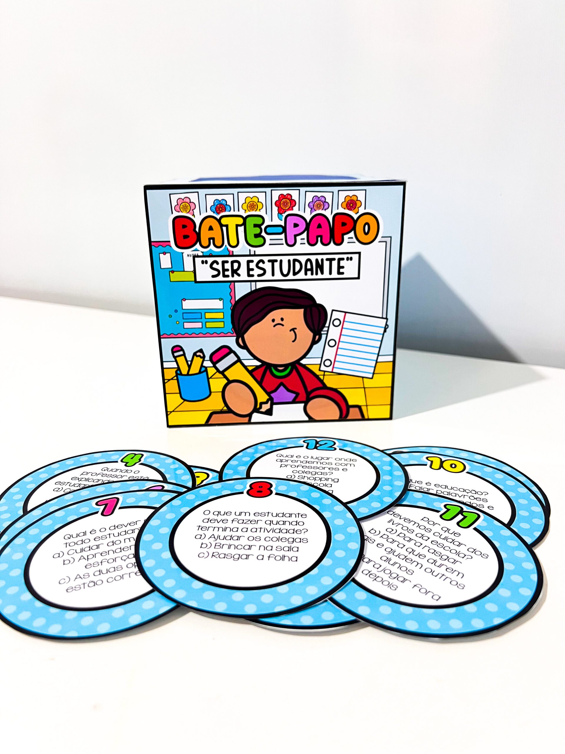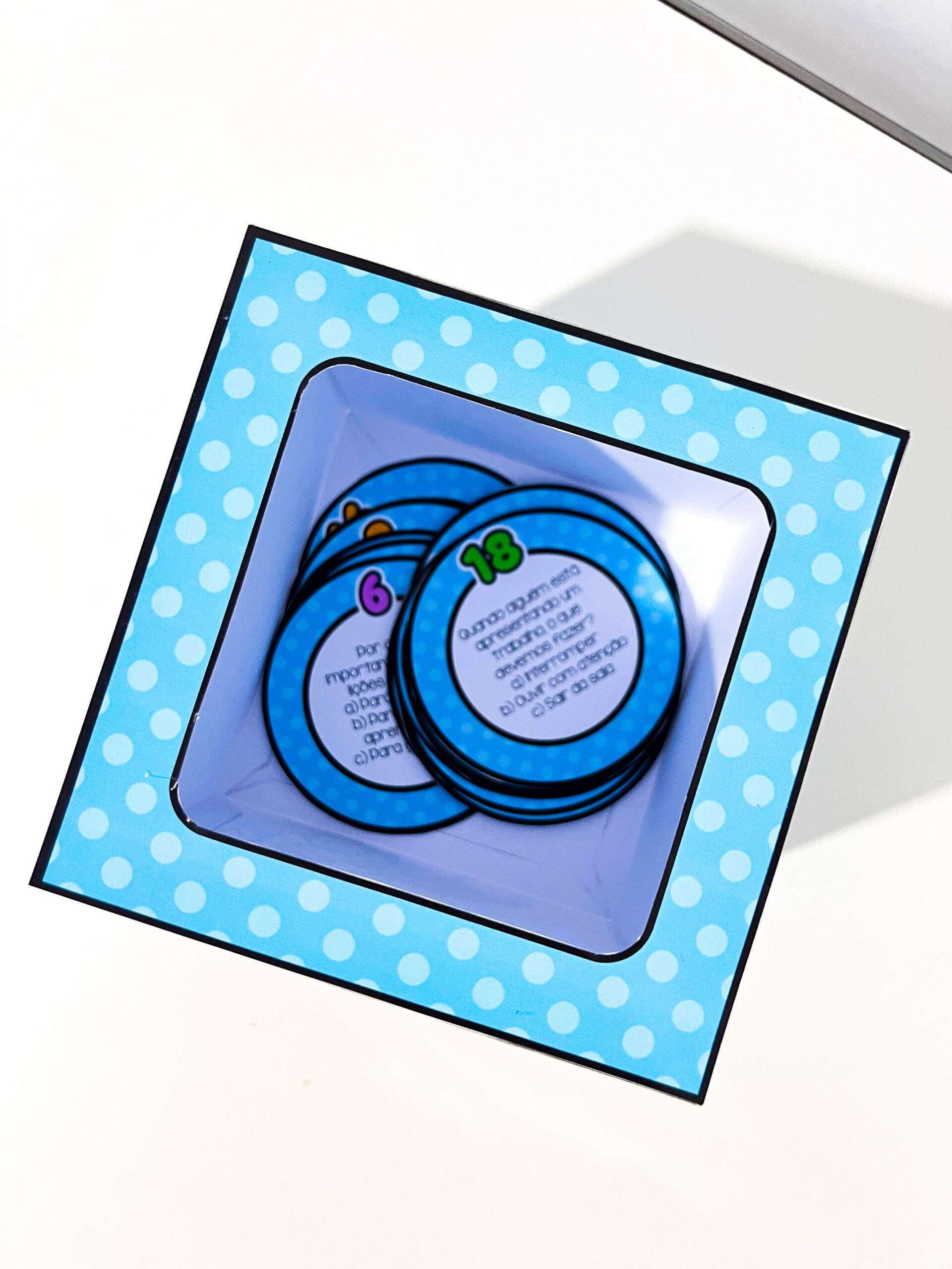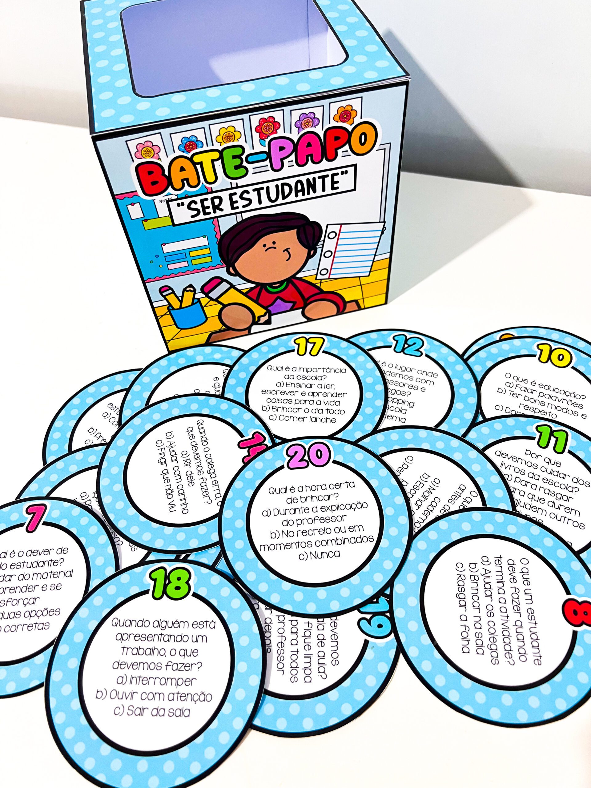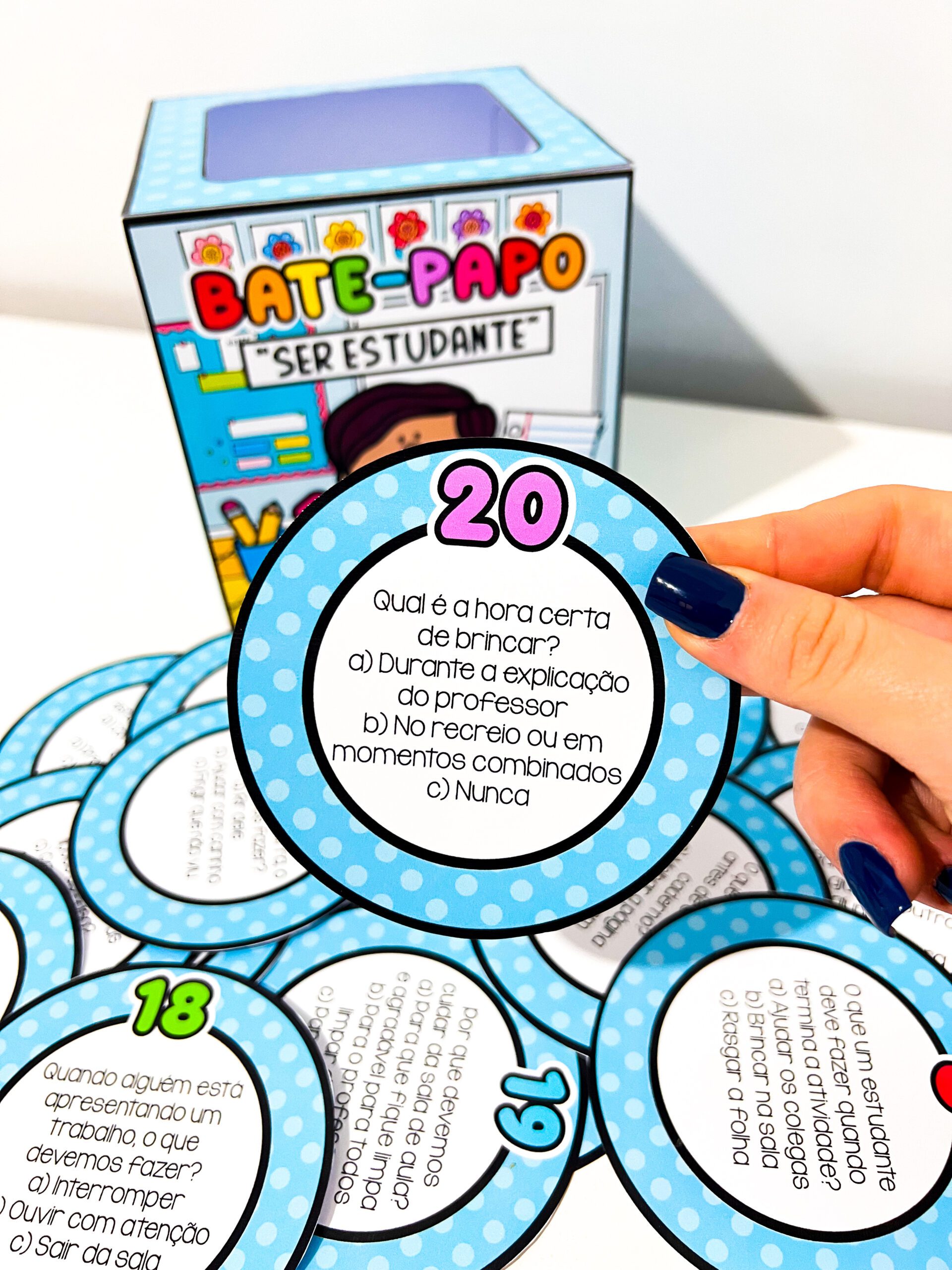 O material é composto por 20 perguntas em formato de fichas redondas, organizadas em uma caixinha temática colorida e atrativa, tornando a dinâmica envolvente e prazerosa para as crianças.